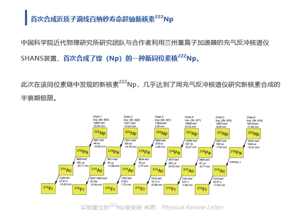 近日,近代物理所科研成果“首次合成近质子滴线百纳秒寿命超铀新核素222Np”入选《科技导报》评选出的2020年度“中国十大重大科学进展”。222Np是近代物理所继发现新核素219,220,223, 224Np之后,在该同位素链中发现的又一个新核素。科研人员利用兰州重离子加速器的充气反冲核谱仪SHANS装置,首次合成了半衰期为380纳秒,且具有α放射性的Np新同位素核222Np(N = 129,Z = 93)。这几乎达到了该类装置研究短寿命核素的极限。该成...