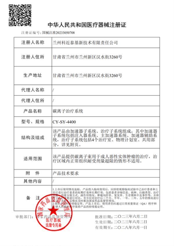 6月2日,安装于兰州重离子医院的国产医用重离子加速器——“碳离子治疗系统”获得国家药品监督管理局(NMPA)批准注册。 该碳离子治疗系统是由中国科学院近代物理研究所及产业化主体公司兰州科近泰基新技术有限责任公司研发生产的具有完全自主知识产权的第二台套国产医用重离子加速器,性能指标达到国际水平。该系统包含4个治疗室,与2019年获批的首台国产碳离子治疗系统(安装于武威市)相比,增加45度和90度2个治疗室,缩...