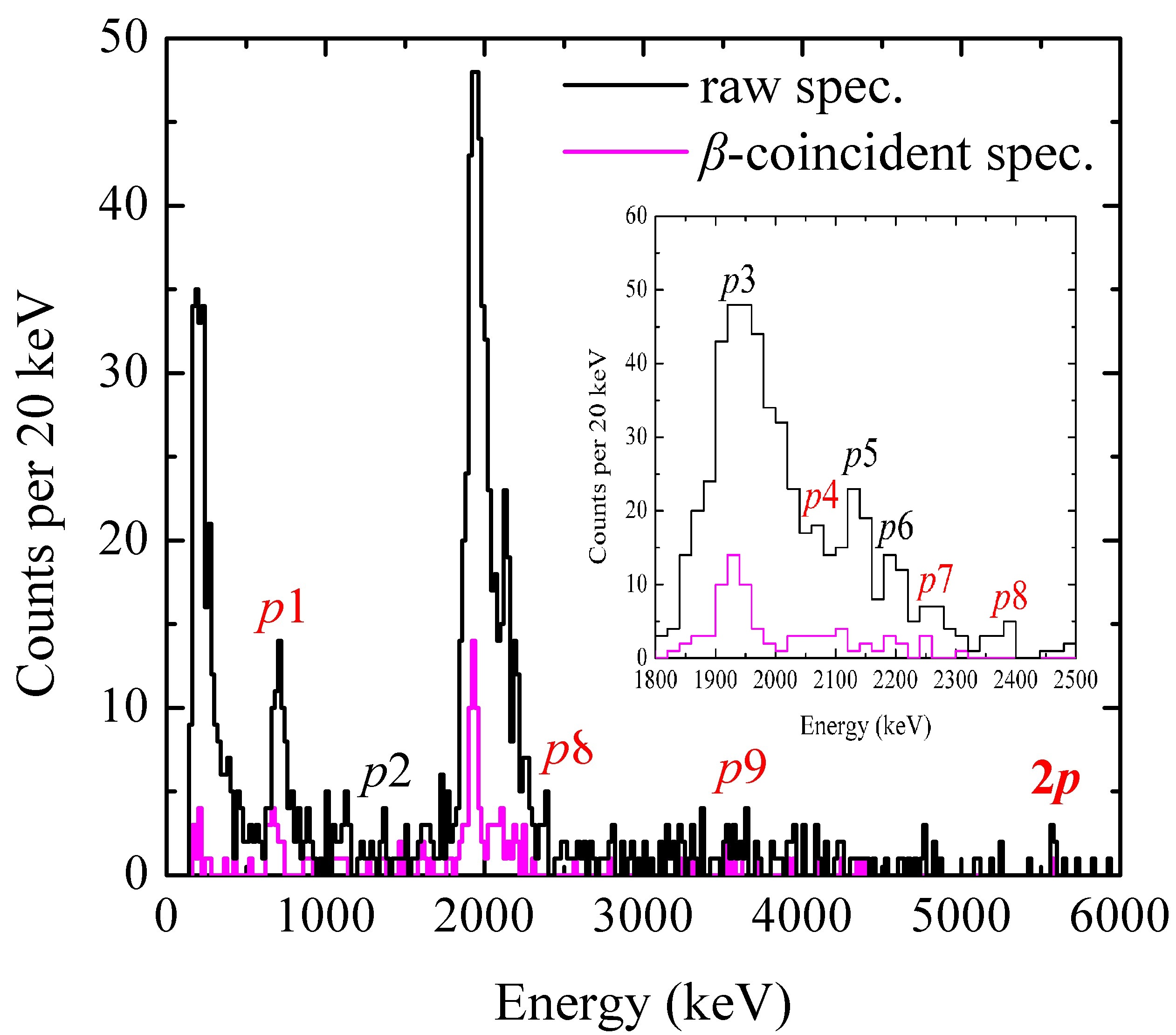 图2 22Si的β延迟质子衰变能谱(红色标记为实验新发现的衰变分支)