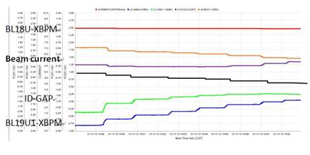 光束线前端XBPM探测器测得的光束中心位置随ID-GAP值的变化情况