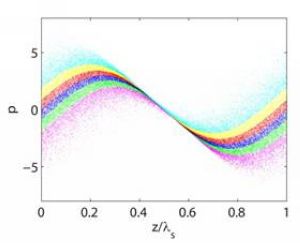 Cooled-HGHG机制电子束相空间演化过程示意图:不同颜色代表不同能量电子,可见在一个种子激光波长范围内,中间部分电子束能散得到了压缩。