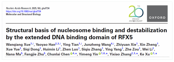 2025年7月31日,同济大学医学院附属上海市第四人民医院许可教授、尹贻蒙教授、上海有机化学研究所张一小研究员和清华大学生命科学学院陈春来副教授联合在Nucleic Acids Research上发表了文章Structural basis of nucleosome binding and destabilization by the extended DNA binding domain of RFX5,首次从结构层面揭示了RFX5如何结合核小体并调控其状态。