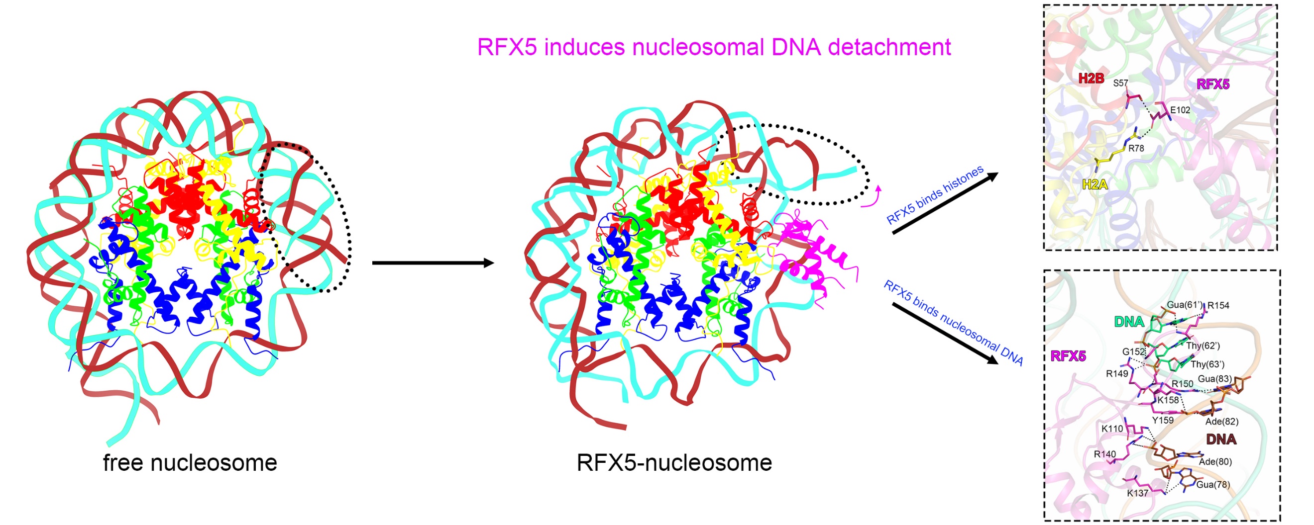 RFX5是目前唯一被报道具有此类“先锋”功能的RFX家族成员,主要参与第二类主要组织相容性复合体(class II major histocompatibility complex,MHC II)的表达调控,其功能缺失会导致裸淋巴细胞综合征(Bare lymphocyte syndrome,BLS)等疾病【3】。前期研究表明,RFX5在体外可以结合核小体,并在体内能够介导核小体重塑,但其具体的分子机制尚未明确【4】。