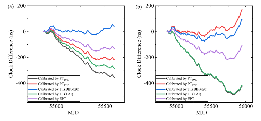 以上研究结果表明,使用脉冲星时校准原子钟在理论上是可行的。随着观测数据的积累以及观测技术的提升,脉冲星时有望实际应用在原子钟频率校准领域。