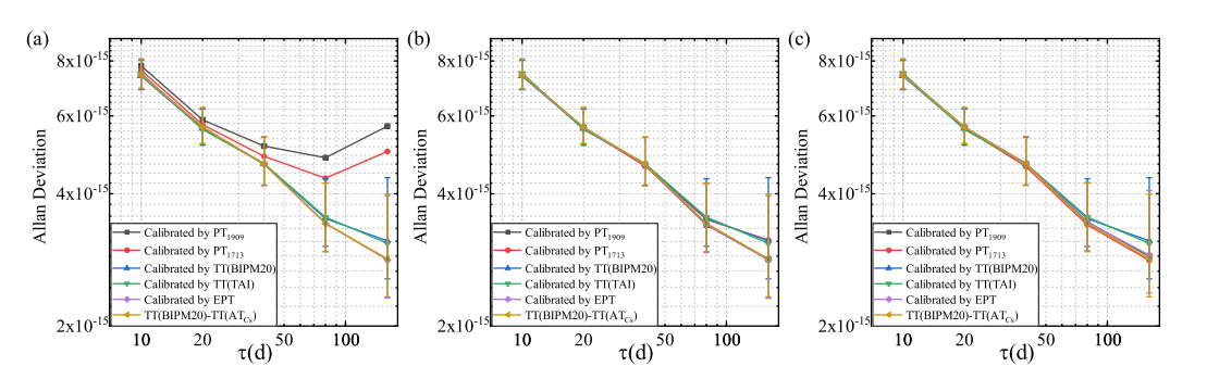 图4. 在一年时间尺度下,经PT1909、PT1713、EPT、TT(BIPM20)和TT(TAI)校准后的铯钟与铯钟本身的稳定度对比图