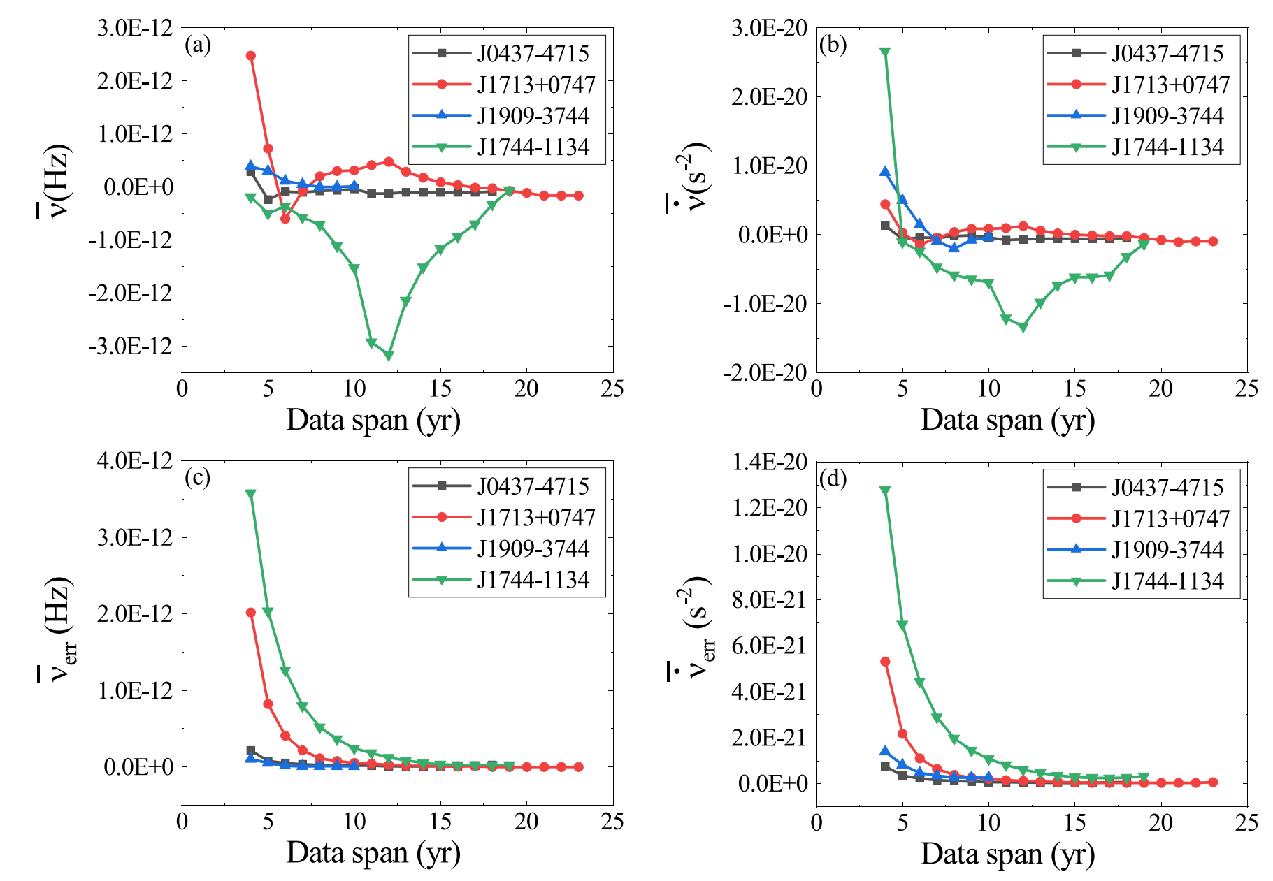 图1 不同数据跨度对脉冲星计时模型参数的影响。