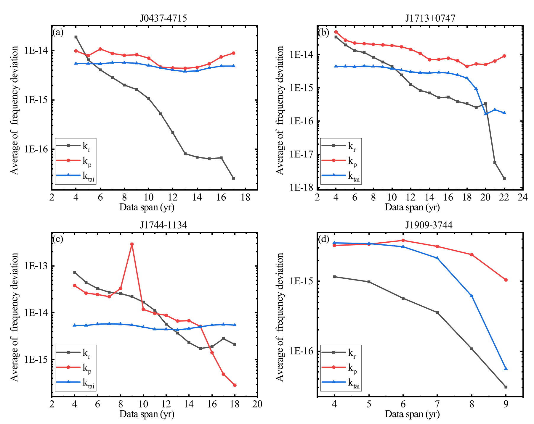 脉冲星时(TT(PT))具有与原子时不同的物理机制,可作为一种时间基准。为了建立准确的脉冲星时,脉冲星计时模型参数的确定尤为重要。本团队研究了在确定脉冲星计时模型参数时,不同数据跨度对其精度的影响(图1),并重点分析了TT(PT)在一年时间尺度上的准确度。研究团队利用四颗高精度脉冲星的计时观测数据,比较了TT(PT)相对于TT(BIPM) 在理想(kr)和实际(kp)情况下的频率偏差(图2)。实验结果显示,当J0437-4715、J1713+0747和J1909-3744的数据跨度分别达到13 年、14 年和 6 年时,在理想条件下 TT(PT) 的准确度优于 TT(TAI),而在实际条件下TT(PT) 的准确度略差于 TT(TAI)。