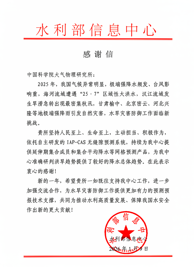 近日,中国科学院大气物理研究所包庆研究员、朱涛博士等专家团队研发的IAP-CAS无缝隙预测系统,凭借中高纬季节内振荡指数等核心技术模块,在水利部信息中心成功落地部署并发挥重要作用,获水利部信息中心高度认可与诚挚感谢。2025年我国气候异常特征显著,极端强降水、台风等灾害频发,海河流域“25·7”大洪水、汉江流域旱涝急转等多起灾害事件给防御工作带来严峻挑战。在此背景下,我所坚守“人民至上、生命至上”理念,依托地球系统数值模拟大科学装置,为水利部信息中心提供延伸期集合成员、集合平均降水等网格预测产品,为精准研判洪旱趋势提供了可靠依据,有效支撑了多起极端天气事件的科学应对工作。该系统不仅实现显著技术突破,更彰显巨大社会价值,提升了我国水旱灾害防御能力,为全球气候变化研究与应对提供了中国经验。未来,我所将继续深化与水利部信息中心的交流合作,聚焦预测预报核心技术瓶颈,强化技术创新和成果转化,为推动水利高质量发展、筑牢国家水安全屏障贡献更多科技力量。