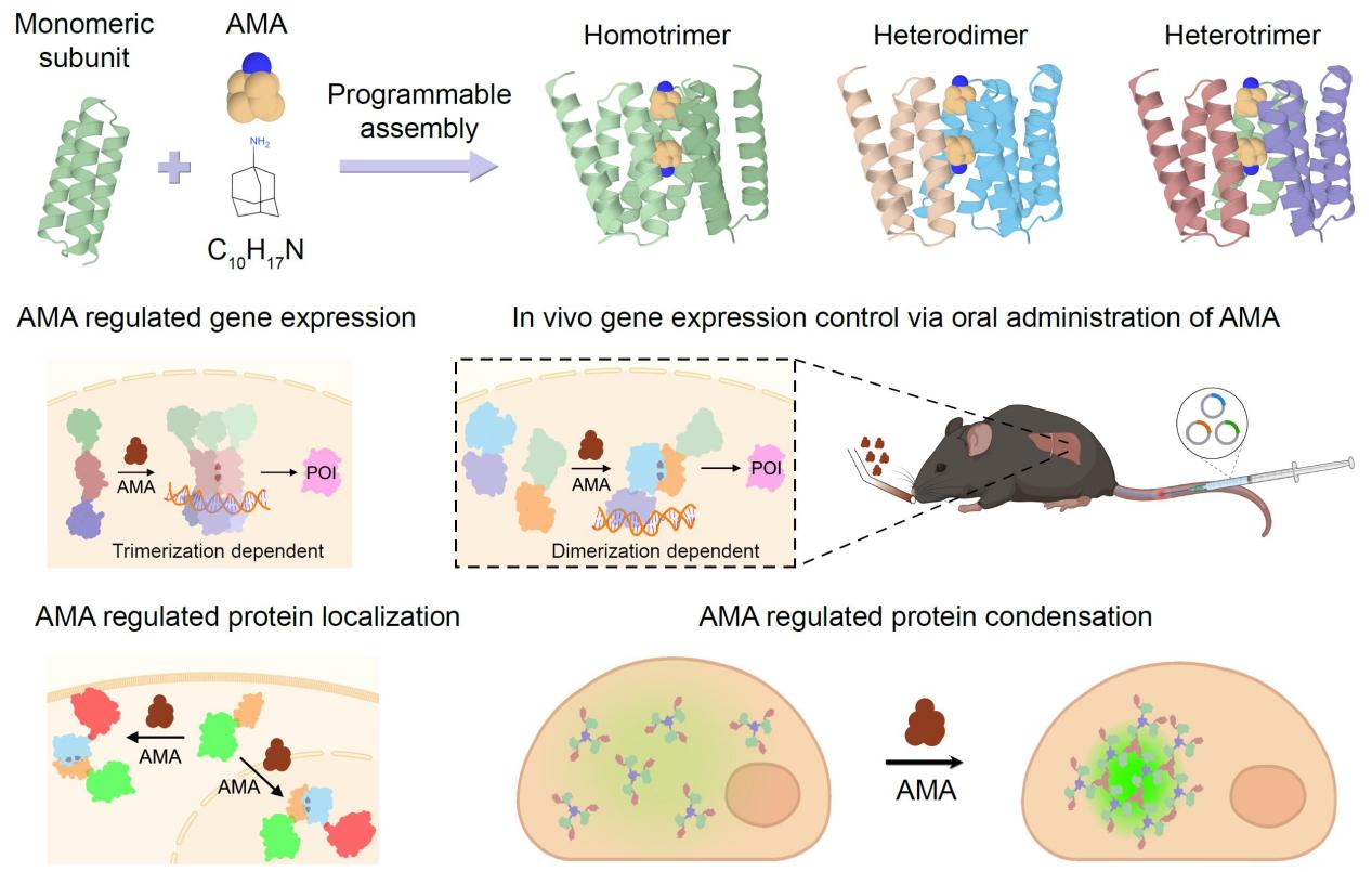 蛋白质的小分子调控多聚化是化学生物学精准操控生命过程的核心工具,在基础研究与细胞治疗中具有不可替代的价值。然而,天然调控系统稀缺,现有化学诱导二聚化(CID)系统局限于二聚化、依赖天然骨架且存在药物毒性问题,高阶多聚体(如三聚体)的从头设计长期面临瓶颈。近期,西湖大学曹龙兴团队和解明岐团队在小分子调控蛋白质多聚体的从头设计领域取得重要突破。研究成功建立对称性引导的从头设计策略,实现了小分子调控的同源三聚体、异源二聚体及异源三聚体的构建,破解了这一领域的关键难题。