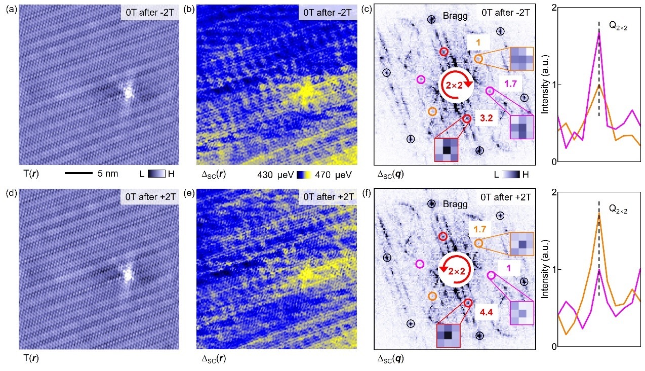 在此基础上,科研团队进一步实现了CsV3Sb5手性PDW的磁场可逆调控。实验中,先对样品施加垂直于笼目晶格平面的-2 T磁场,再将磁场撤回至0 T后进行能隙空间成像;随后施加反向的+2 T磁场,并在磁场撤回至0 T后对同一区域进行重新测量。结果显示,在-2 T磁场调控后,与初始的逆时针手性相比,2×2配对调制切换为顺时针手性(图2b,c);而在+2T磁场调控后,2×2配对调制又切换为逆时针手性(图2e,f)。尤为关键的是,所有能隙成像均在零场条件下进行,这表明所观测到的手性调控并非简单的磁场响应。即使撤掉磁场,PDW的手性仍然继续维持在切换后的稳定状态。这一结果与此前报道的CsV3Sb5手性超导输运行为形成呼应,也为其时间反演对称性破缺配对提供了更加直接的微观实验证据。