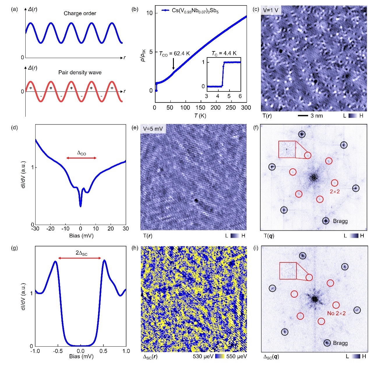 此外,科研团队还利用非磁性掺杂样品Cs(V0.93Nb0.07)3Nb5进行了对比实验。结果表明,在掺杂样品中,2×2 CDW信号依然清晰可辨(图3e,f),超导能隙甚至出现增强(图3g);但在配对能隙空间分布的傅里叶分析中,2×2配对调制信号完全消失(图3i)。这一结果表明PDW受到了非磁性杂质散射的破坏,为其具有相位反转特征(图3a)提供了有力实验证据。